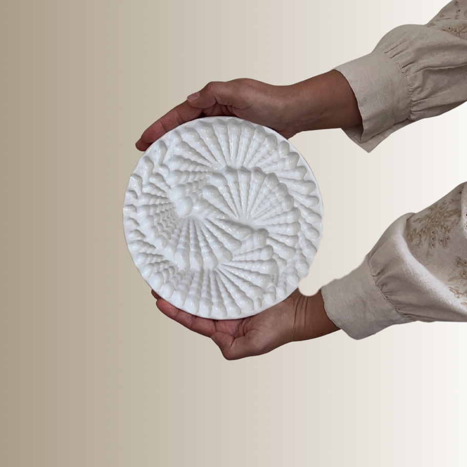 Based on the original Shellscapes® artworks by artist Katarina Tifft and created in collaboration with ceramicist Karen Tharp, this piece is part of the Shellscapes® Ceramic Series, a small-batch collection that translates Katarina’s sculptural shell designs into heirloom ceramic form. Designed to be collected and displayed as a set, these disks offer endless possibilities for creating a cohesive, artful arrangement.